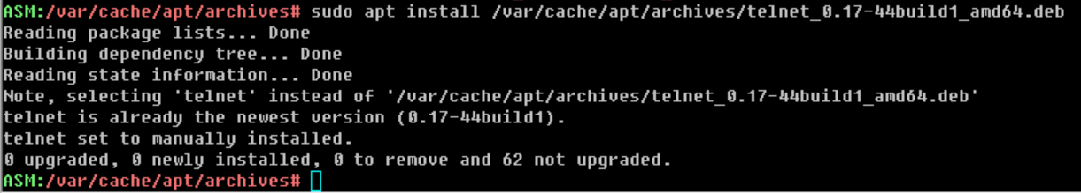 sudo apt install /var/cache/apt/archives/telnet_0.17-44build1_amd64.deb